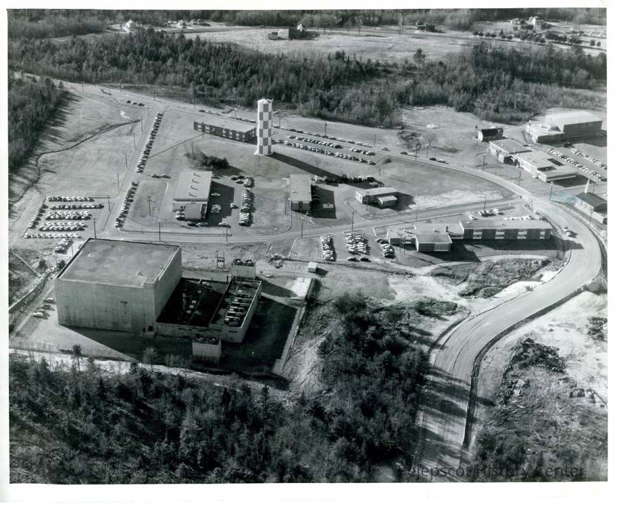 Black and white photograph of Topsham Air Force Station home of the Bangor Air Defense Sector (SAGE). The massive concrete structure in the left foreground is the operations building, nerve center of the Sector and housing a vast array of electronic equipment. Undated