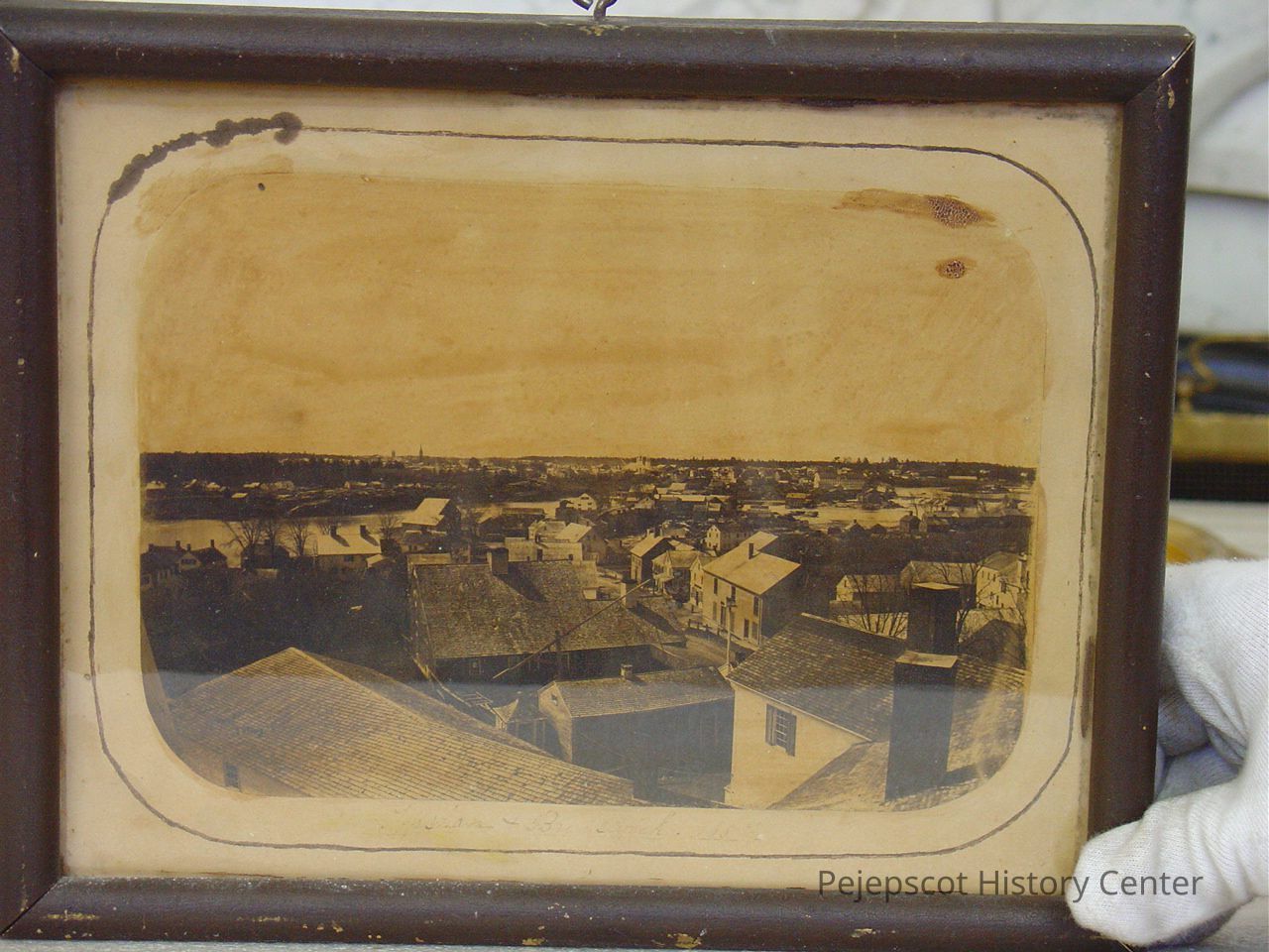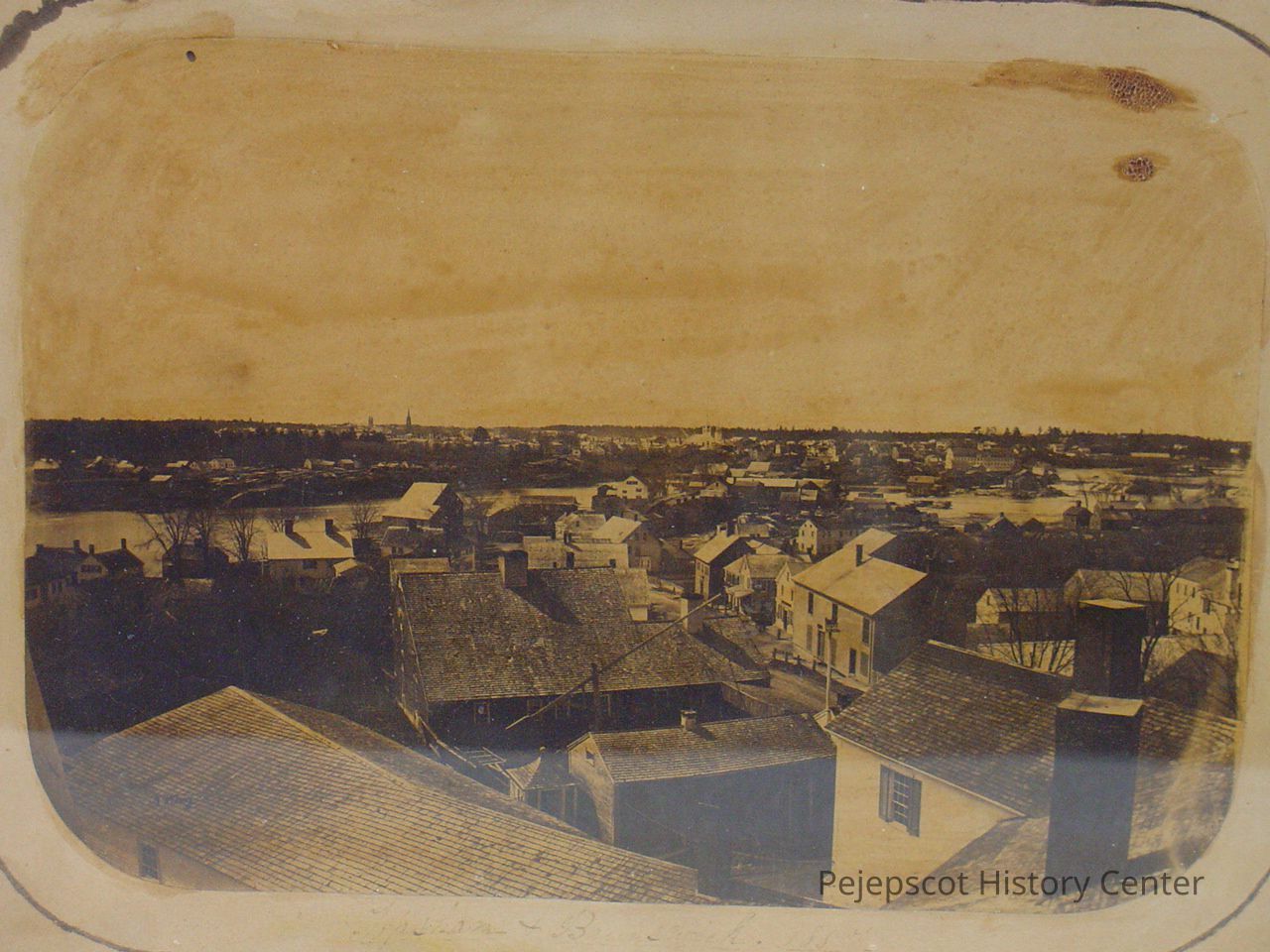Framed, matted B&W photo of Topsham and Brunswick, Maine. A note on the back says, "Taken from the steeple of the Baptist Church in Topsham June 1857, by A. Wing daguerrean artist." Then signed Sarah A. Thompon. Title in pen at the bottom in the front is barely legible, but it reads "Topsham & Brunswick 1857" It is mounted in wood frame. The corners of the photo have been rounded and an ink line parallel to the photo edges goes around it. Overall size: 22.25 cm h x 27.50 cm w x 2.25 cm d.