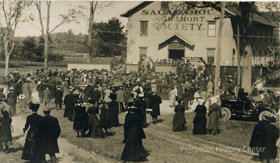 A B/W photograph of the entrance and crowd at Topsham Fair.