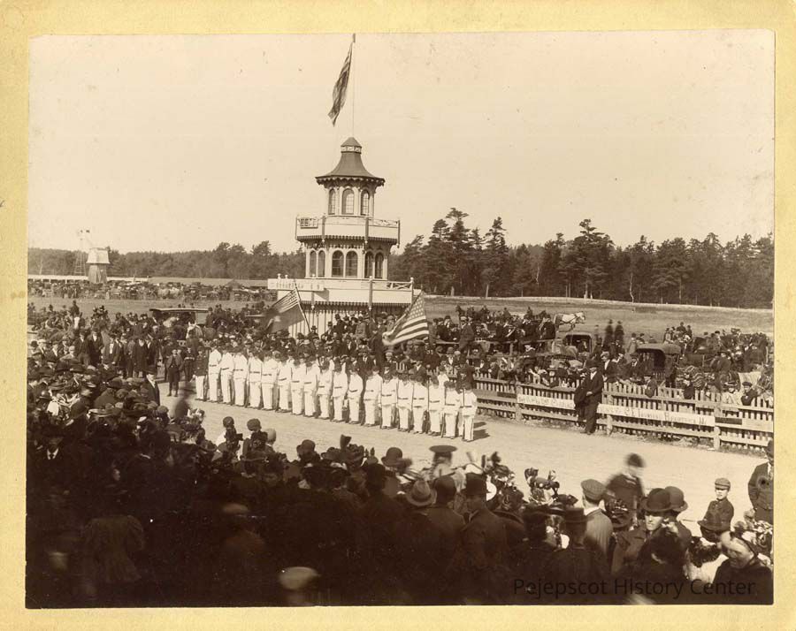 Color photograph of parade at Topsham Fairground - boys in white uniforms (color guard), judges' stand, year unknown.