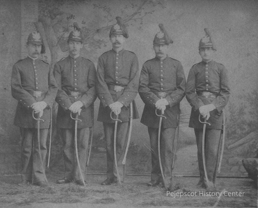 An undated black and white photo shows five members of the Topsham, Maine, Fire Department. Charles Alexander may be the man in the middle