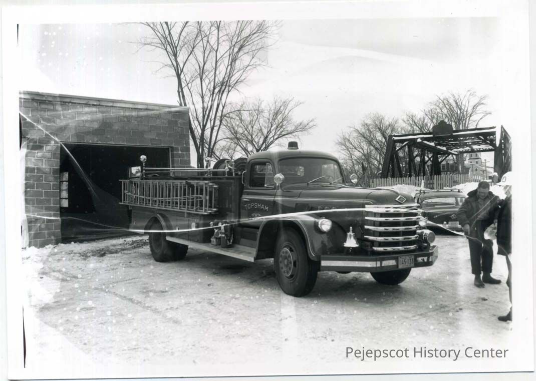 A Topsham fire truck sits in front of the new fire station. A car and the bridge over the Granny Hale stream appear on the right side of the photo.
