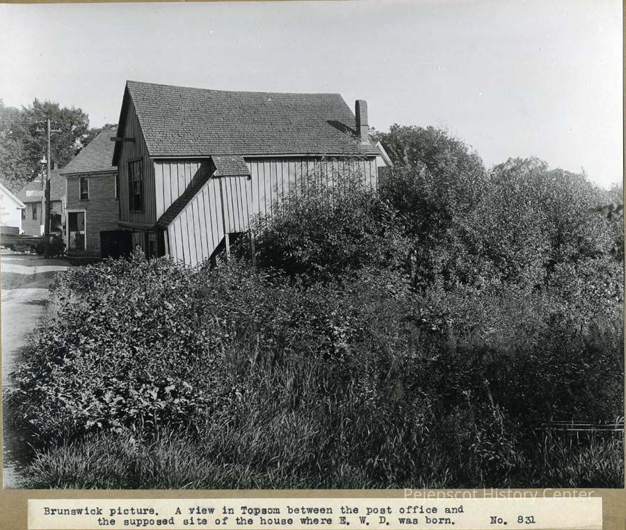 A black and white photo of the Topsham post office. A note at the bottom says, "A view in Topsham between the post office and the supposed site of the house where E.W.D. was born." Undated