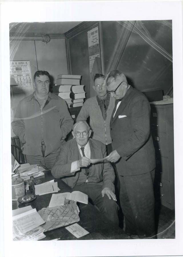 B/W photograph of Selectmen Walter "Pop" Williams (sitting), Harold Ward and Ray Hanson (standing). Another man, B. Holmes, is handing "Pop" Williams hurricane money.