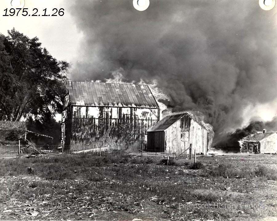 A black & white photograph of a fire at the Topsham Town Farm. The frame of the barn can be seen engulfed while the smoke fills the sky. The photo is part of a collection of local fire photos, collected by former Brunswick firefighter Alfred LeTarte.