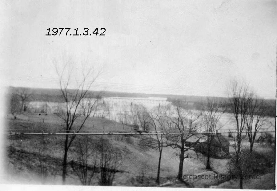 A B/W photograph of Topsham Town Landing, looking down the Androscoggin River towards the railroad bridge. Undated
