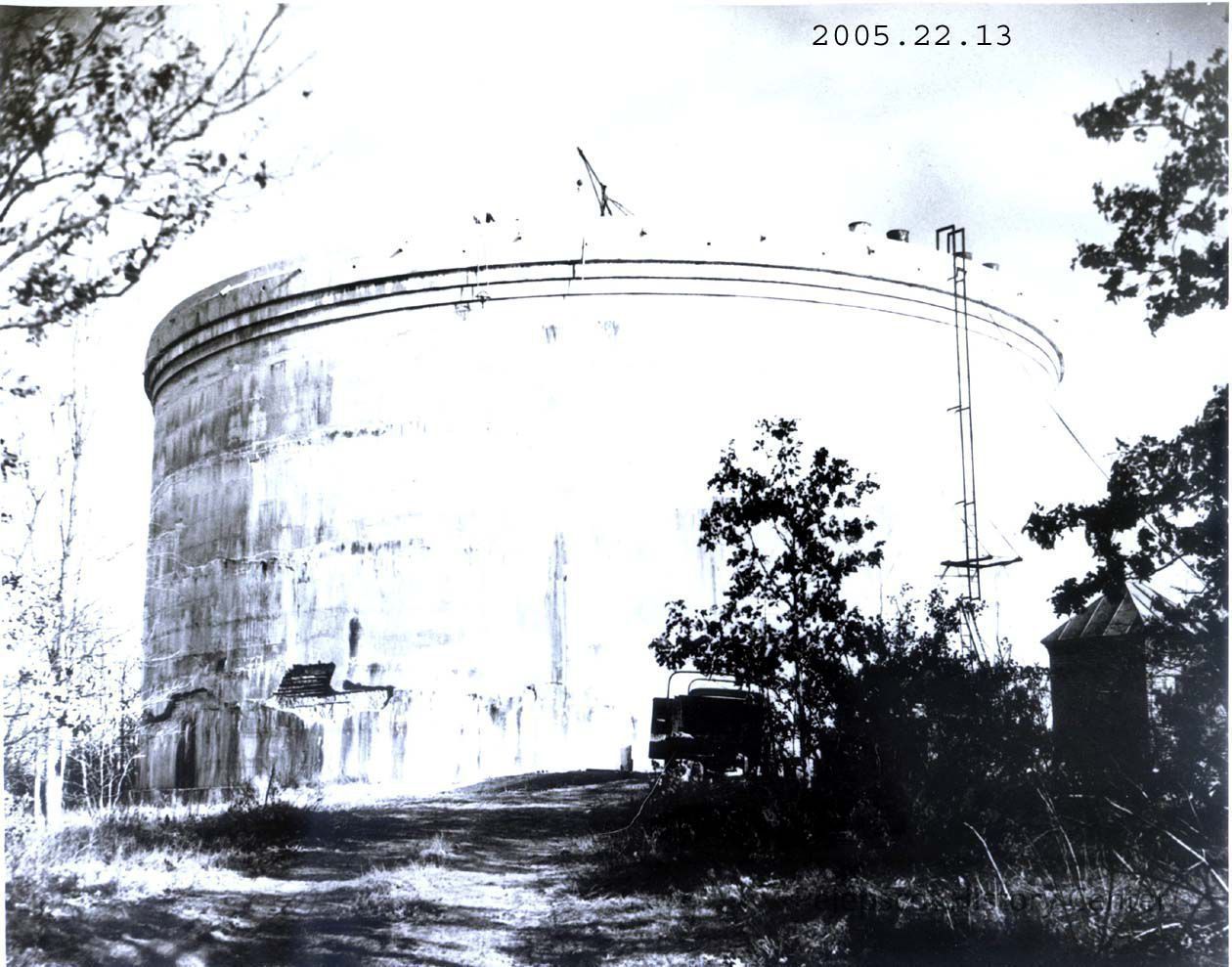 An outside view of the Topsham Water Tower Sagadahoc County, Maine. Shows some of the deterioration of the concrete.