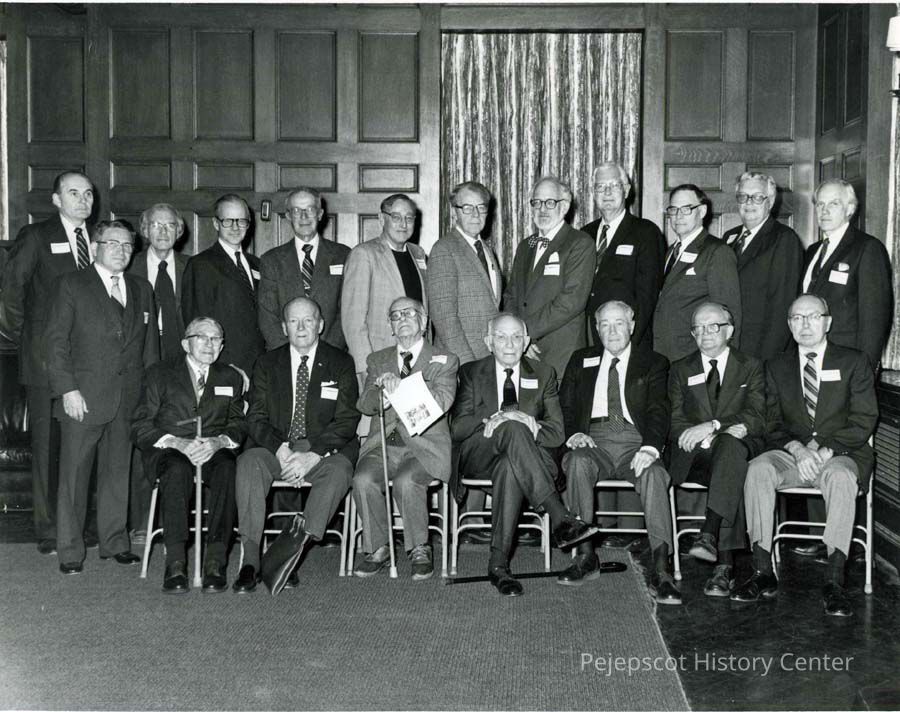 B/W photo of the Town and College Club in the Maine Lounge, Bowdoin College. Back row first on left, Al Fuchs, professor of Psychology, 3rd from right Leroy Greason, 2nd from right Dick Leighton. Front row 3rd from right Philip Beam. Inscribed on the back: "town & college". 1960Lexicon
