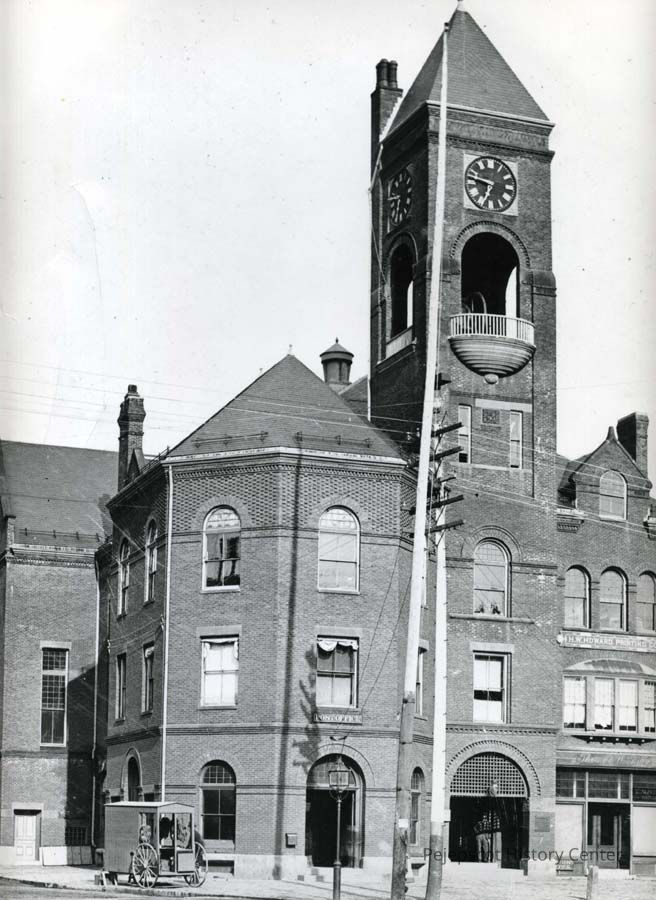 A B/W photo of the Brunswick Town Hall in 1883. It contained the following businesses: H.W. Howard Printing Co.; Post Office; T. Albert Field, watchmaker.