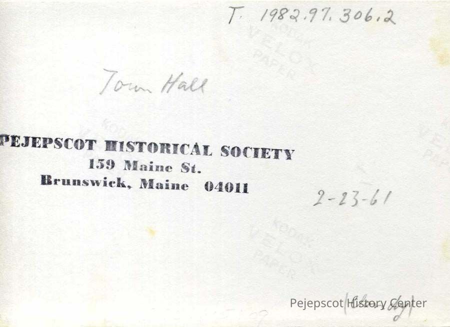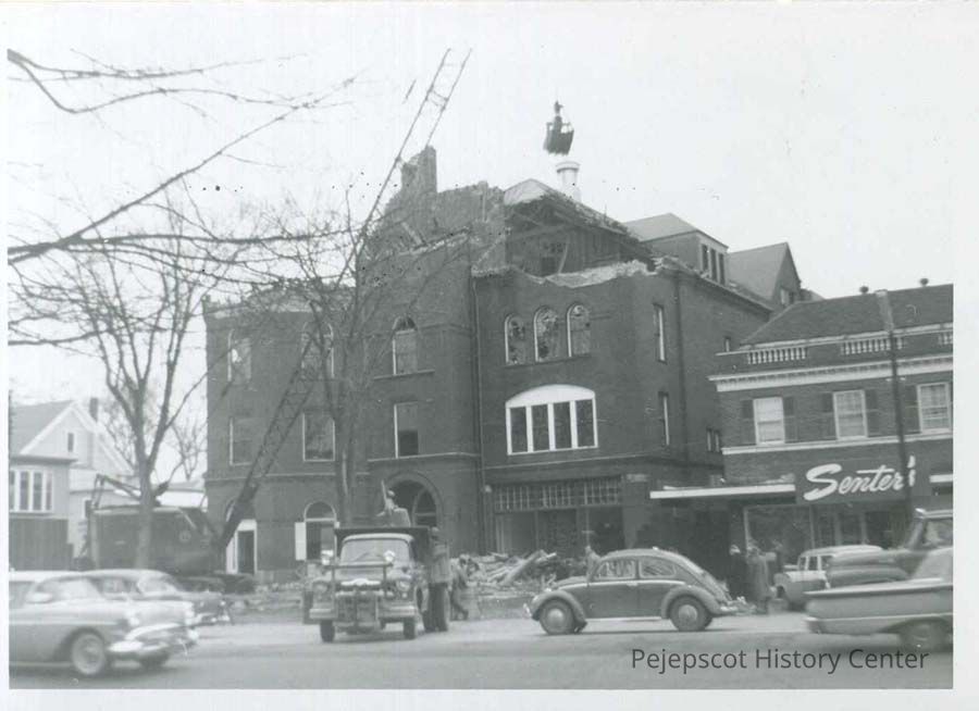 B/W photo of the old Town Hall on Maine Street being torn down, February & March 1961.