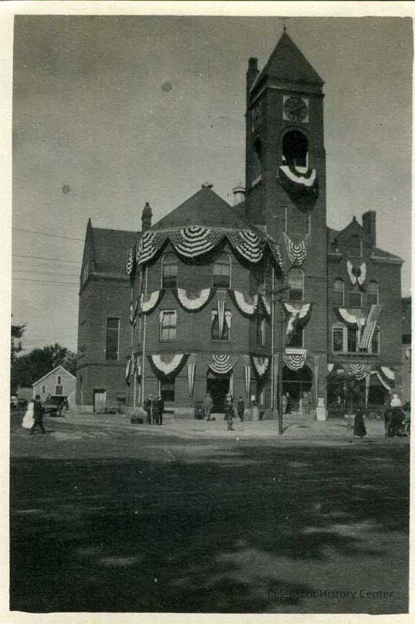 A black and white photo of the old Town Hall building on Maine Street, decorated with bunting for a parade.