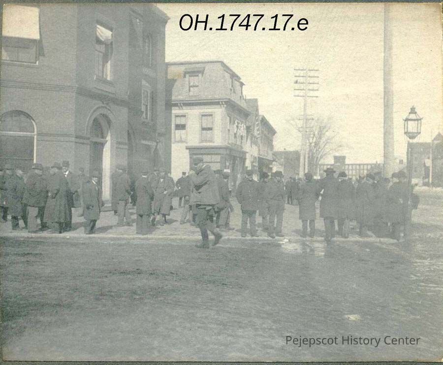 A B/W photograph of Town Meeting Day, Brunswick, ME. Showing a large number of men standing in front of the old Town Hall. circa 1899.