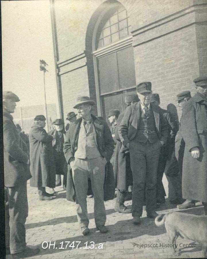 A B/W photograph of a group of men outside the Town Hall, Brunswick, ME on Town Meeting Day. circa 1899.