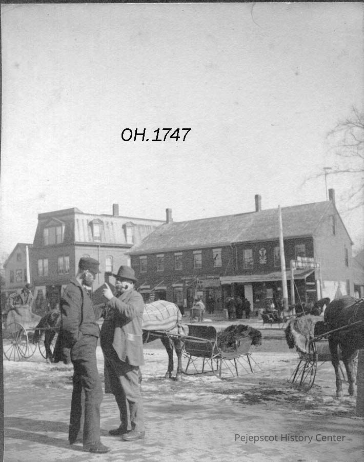 A B/W photograph of Brunswick Town Meeting Day, Brunswick, ME showing two men standing outside the Old Town Hall. circa 1899