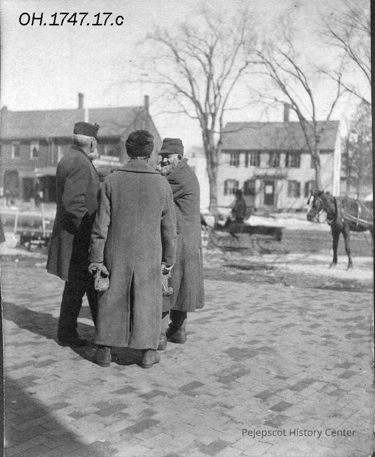 A B/W photograph of Town Meeting Day, Brunswick, ME showing three men talking. circa 1899