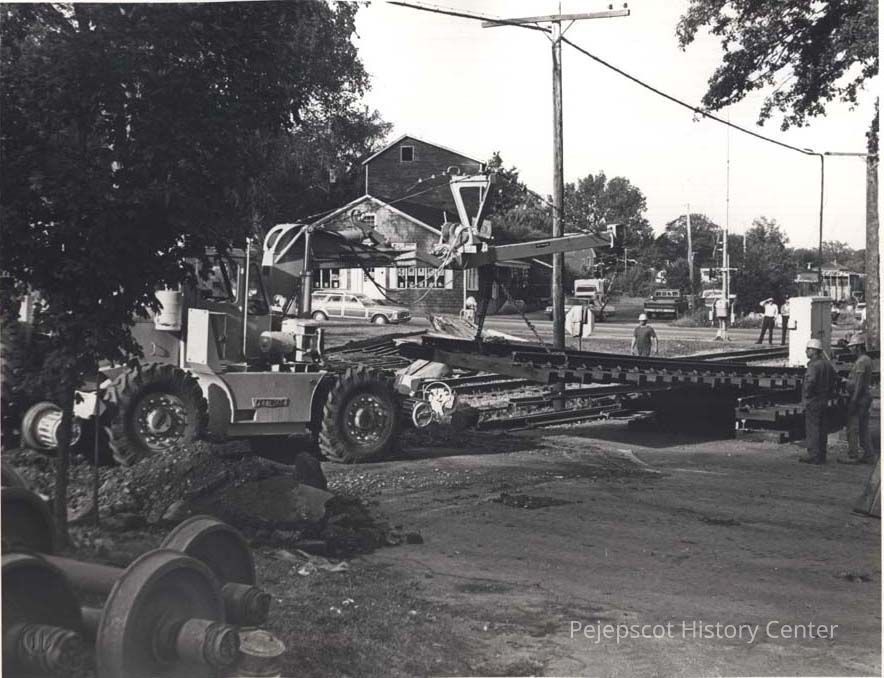 A B/W photograph of track repairs at the corner of Park Row and Fitch Place. Undated