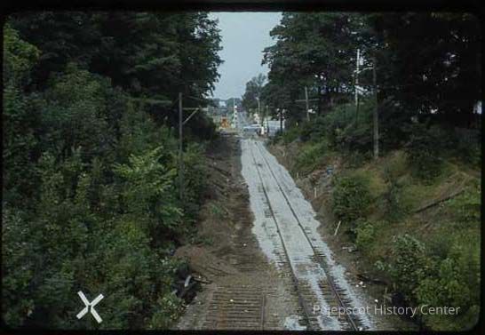 A color slide view of the tracks after the wreckage has been removed and the tracks repaired. The view is looking from the Federal Street overpass towards the Park Row and Maine Street crossings. 08/1983.