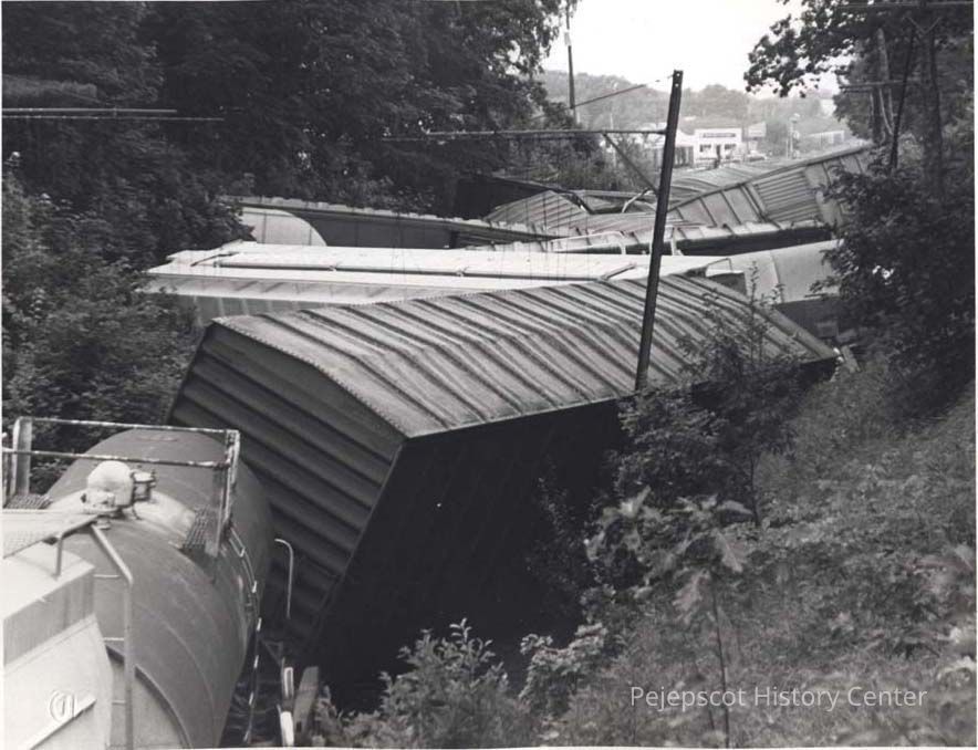 A B/W photograph of some of the wrecked cars as seen from the Federal Street overpass. Undated