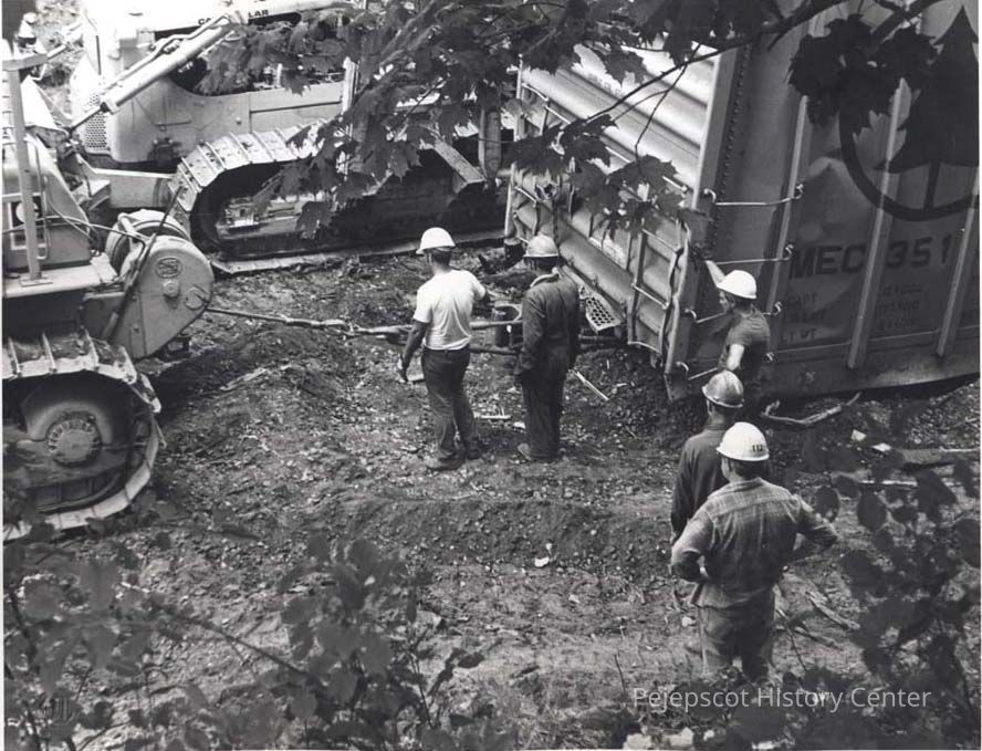 A B/W photograph of a derailed car being pulled by a bulldozer. This is from the August 1983 derailment.