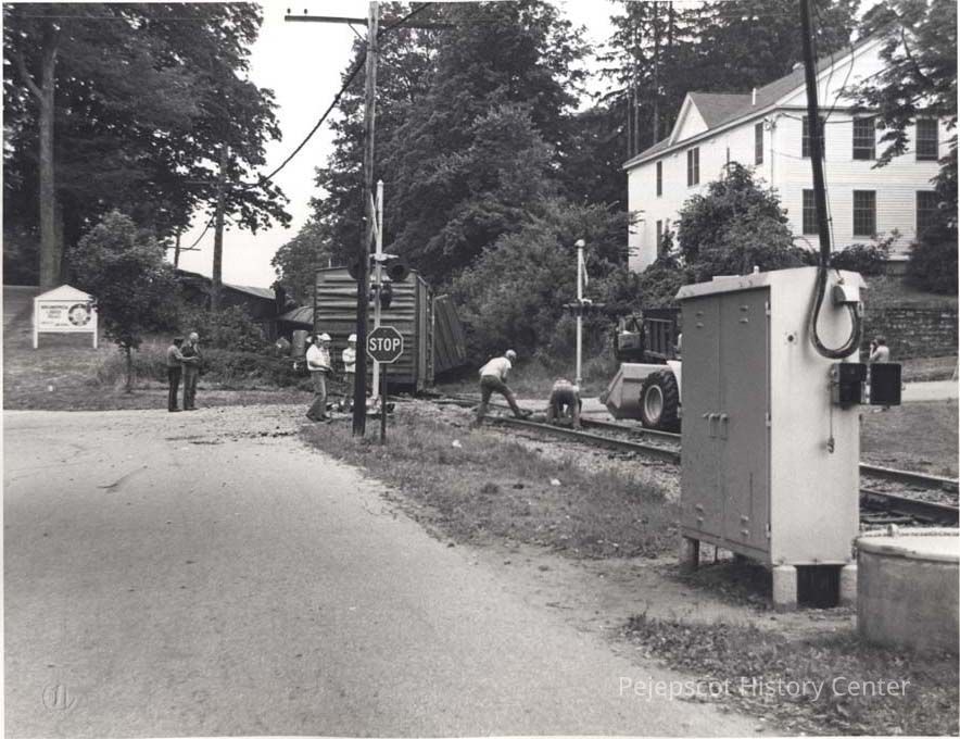 A B/W photograph of the train wreck. You are looking from Fitch Place towards Federal Street. Many railroad cars in a big jumbled mess. This is from the August 1983 derailment.