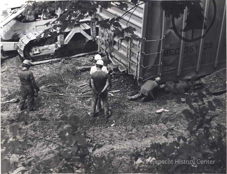 A B/W photograph of workmen getting ready to pull a car back on the tracks. See photo 2014.31.209 for when they moved this car. Undated