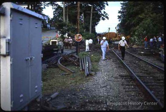 A color slide view looking towards Federal Street at the cleanup effort. The stop sign at the end of Fitch Place can be seen as well as twisted track. 08/1983