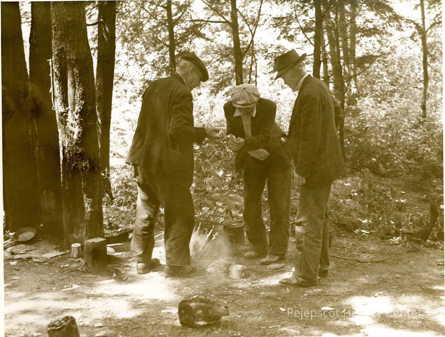 A B/W photograph of three tramps (Hobos) at the Hobo den in Topsham. Undated