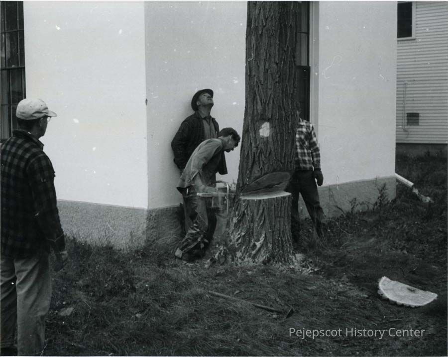 B/W photo of cutting a tree down at the foot of Federal Street, making room Route 1 to Cook's Corner.