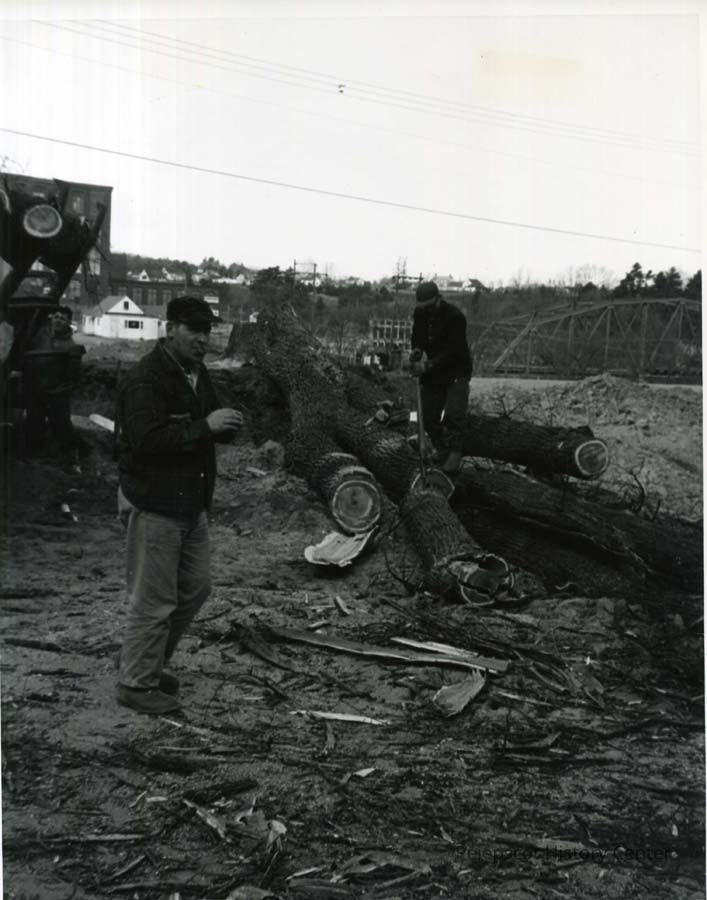 B/W photo of wood being hauled off to make room for the new Route 1 to Cook's Corner..