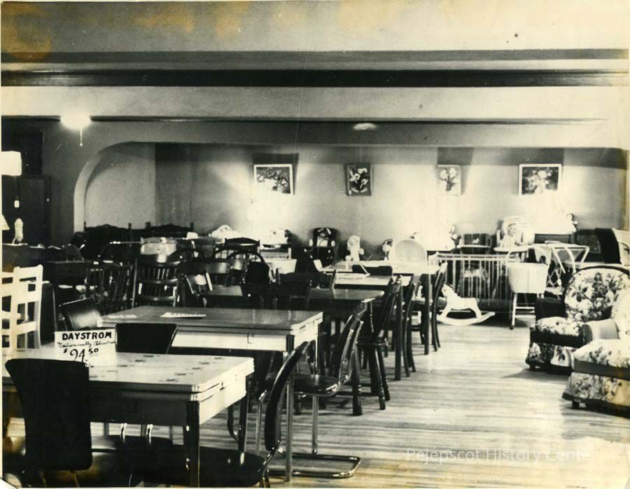A B/W photograph of Treworgy's Furniture and Appliance store, 2nd floor with dinning , bedroom and nursery furniture on display, 11 Pleasant Street.