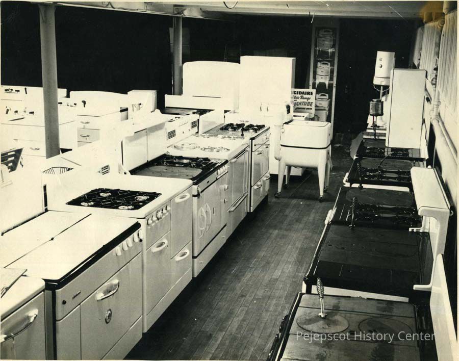 B/W photo of Treworgy's Furniture and Appliance store at 11 Pleasant Street, Brunswick, ME. This is the basement of that store where they sold washers, dryers and toys. No date.