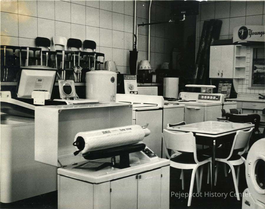 B/W photo of Treworgy's Furniture and Appliance store, 11 Pleasant Street, Brunswick, ME. This is the main floor where they sold appliances, gifts and radios. No date.