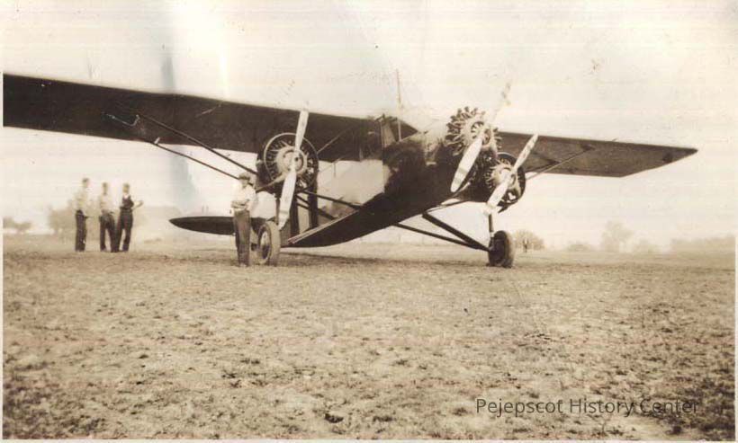 This tri-motor airplane landed at Douglas Field, a farm with a landing strip off Durham Road in Brunswick, in 1931, according to a paper attached to the photo. The people are not identified.