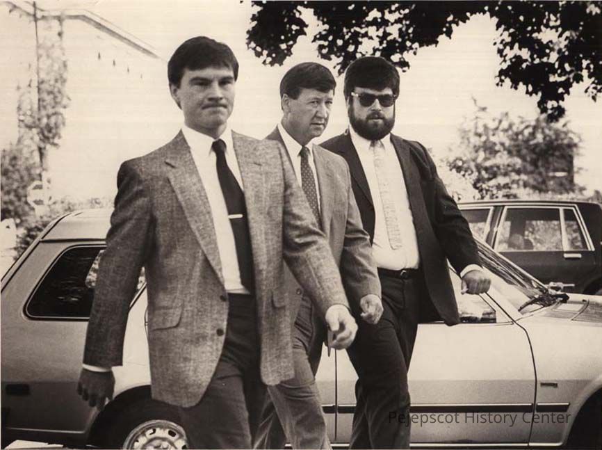 A black and white photo of three members of the Brunswick Police Department (From L to R – James Swint, Donald Girardin and Don Goulet), likely headed to a court appearance, was published in The Times Record in Brunswick, Maine, on 6/26/1990. The photo is labeled "Swint."Collection