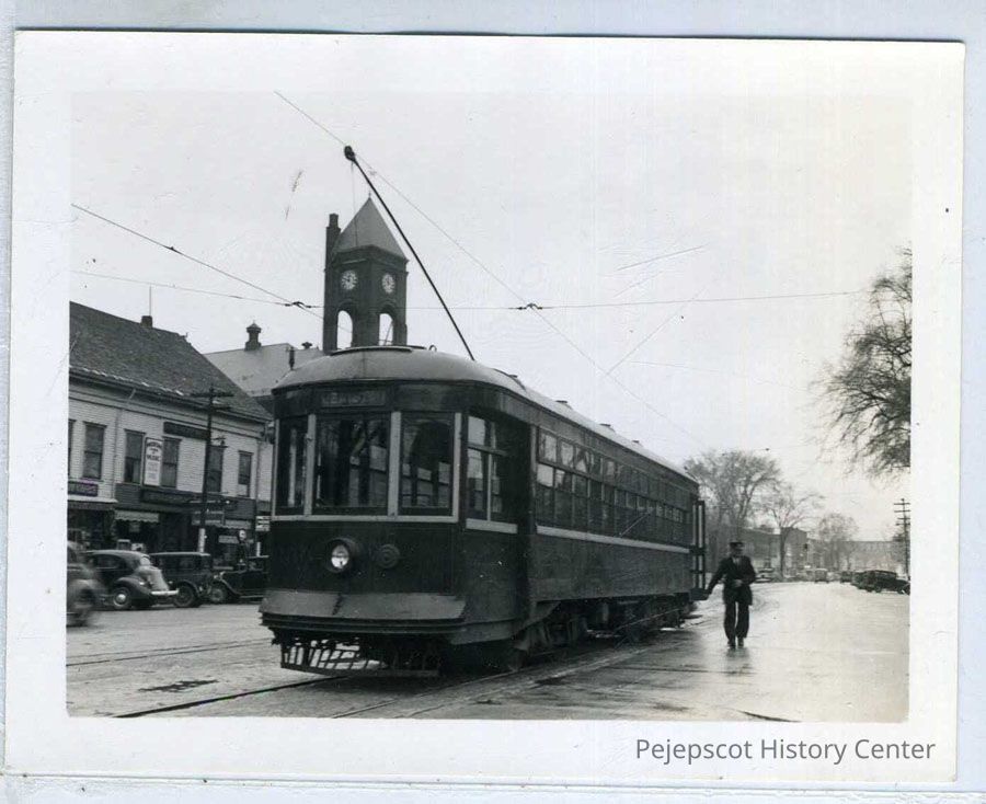 B/W photo of a trolley car on Maine Street, near Pleasant Street on the last day of service, May 15, 1937.