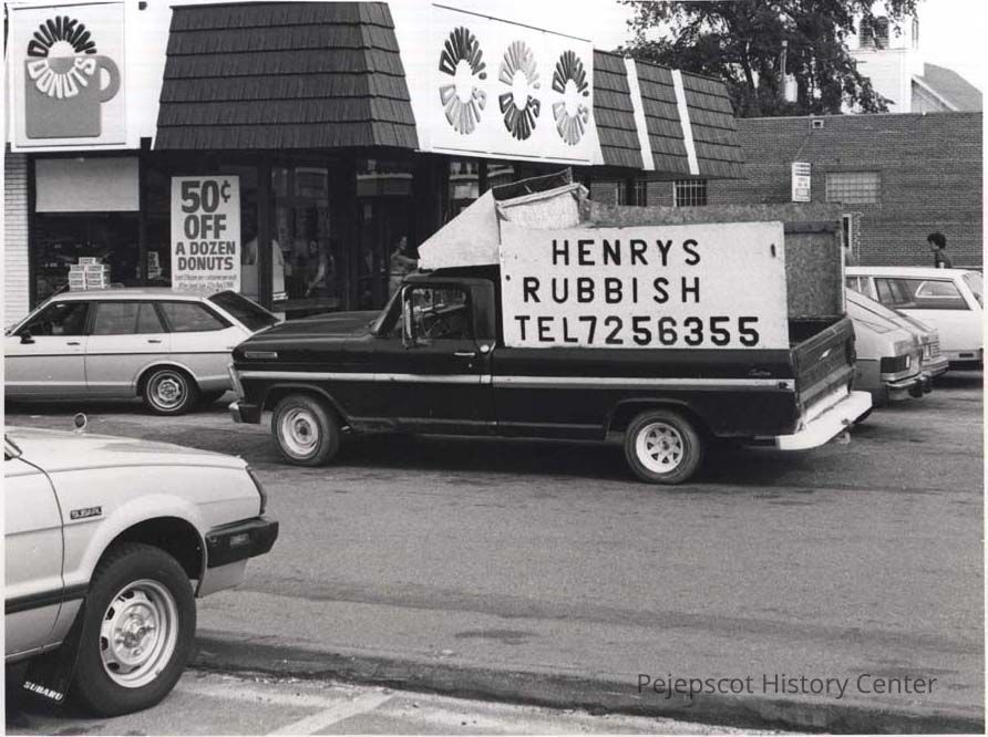 A B/W photograph of a truck parked in front of Dunkin Donuts. The truck has a sign on it, "Henrys Rubbish." Undated