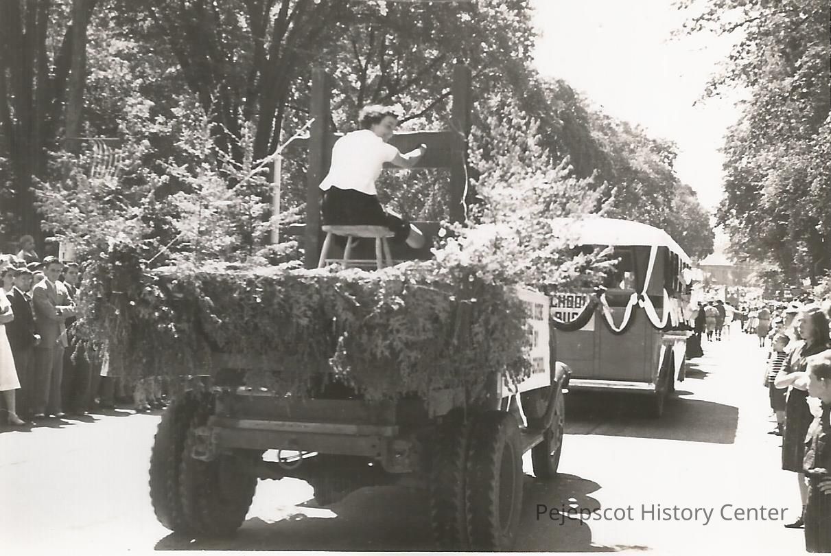 A B/W photo of a truck with someone in the stocks in back in Brunswick's 200th Anniversary parade. Undated