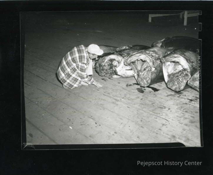 Three dead tuna at Bailey Island being inspected by a man. August 30, 1948