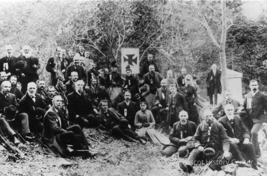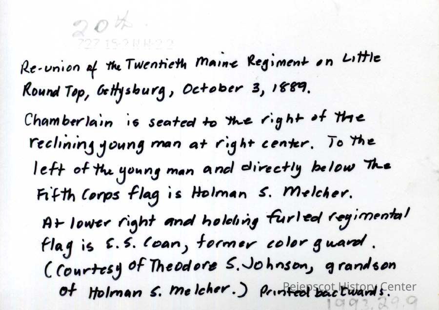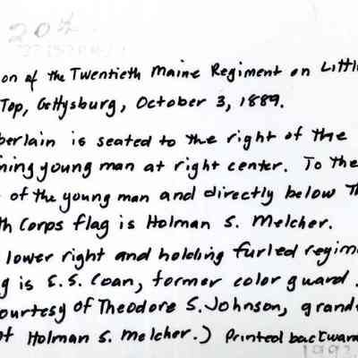 A black and white photo of a group including Joshua L. Chamberlain on Little Round Top, 1889. On the back is written, "Re-Union of the Twentieth Maine Regiment on Little Round Top, Gettysburg, October 3, 1889."