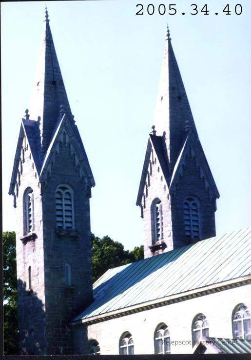 A color photograph of twin towers of Kings Chapel, Bowdoin College. Taken from the rear. See 2005.34.40.a for negative.