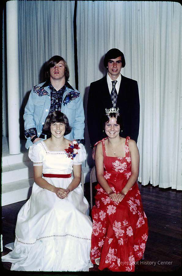 A 35 mm color slide of two contestants and there escorts. The contestant with the crown is Becky Beck. Undated