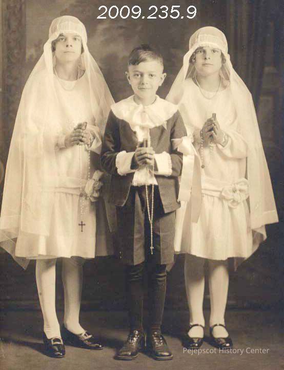 A B/W photograph of two girls and a boy holding bibles and rosaries. They are probably Leona, Evelyn and Hillaire St. Pierre.