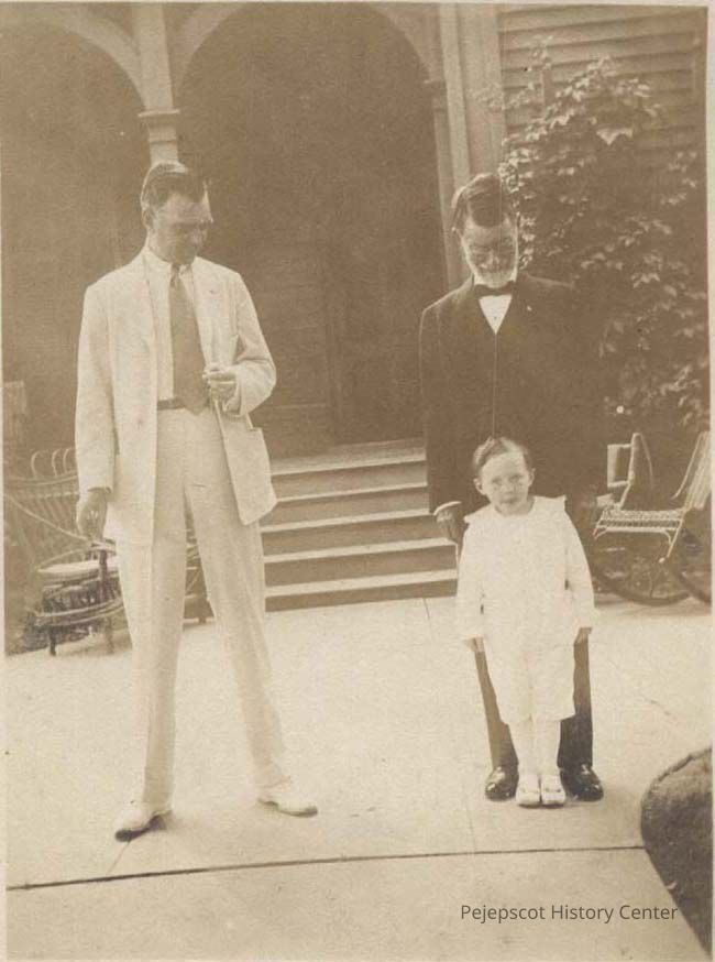 A B/W photograph of two men and boy. Marked on the back, "Grand father, Don & Grandson on 87 birthday... Taken out in the yard." Undated