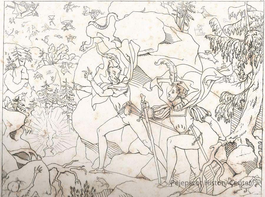 A B/W engraving of 2 men climbing a hill. Illustration seems to depict a Renaissance-era story. The rocks upon which the men climb, and the sky, are full of occult images such as flying skeletons, snakes, owls, and witches on broomsticks.
