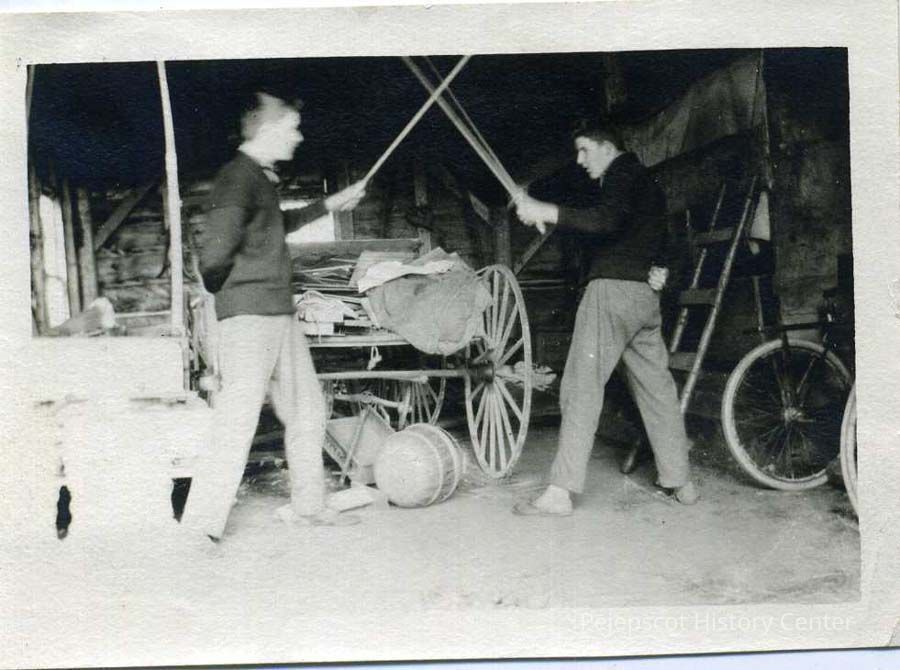 B/W photo of two men "fencing", taken by Laurence Pennell.