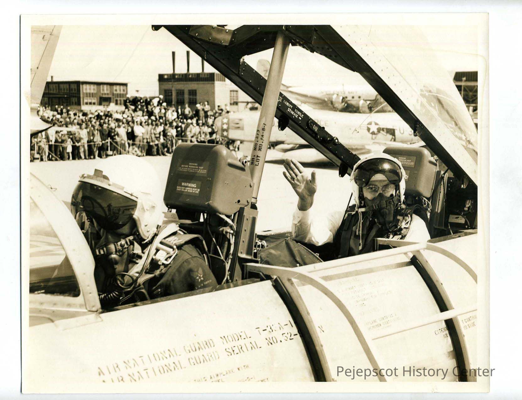 Two men wearing flight helmets sit in an Air National Guard plane with a crowd watching in the background. The markings on the plane read "Air National Guard Model T-33A-1 Air National Guard Serial No. 52-N." "BNAS and T-33A, F-86 in the background" appears on the back of the photo. Undated