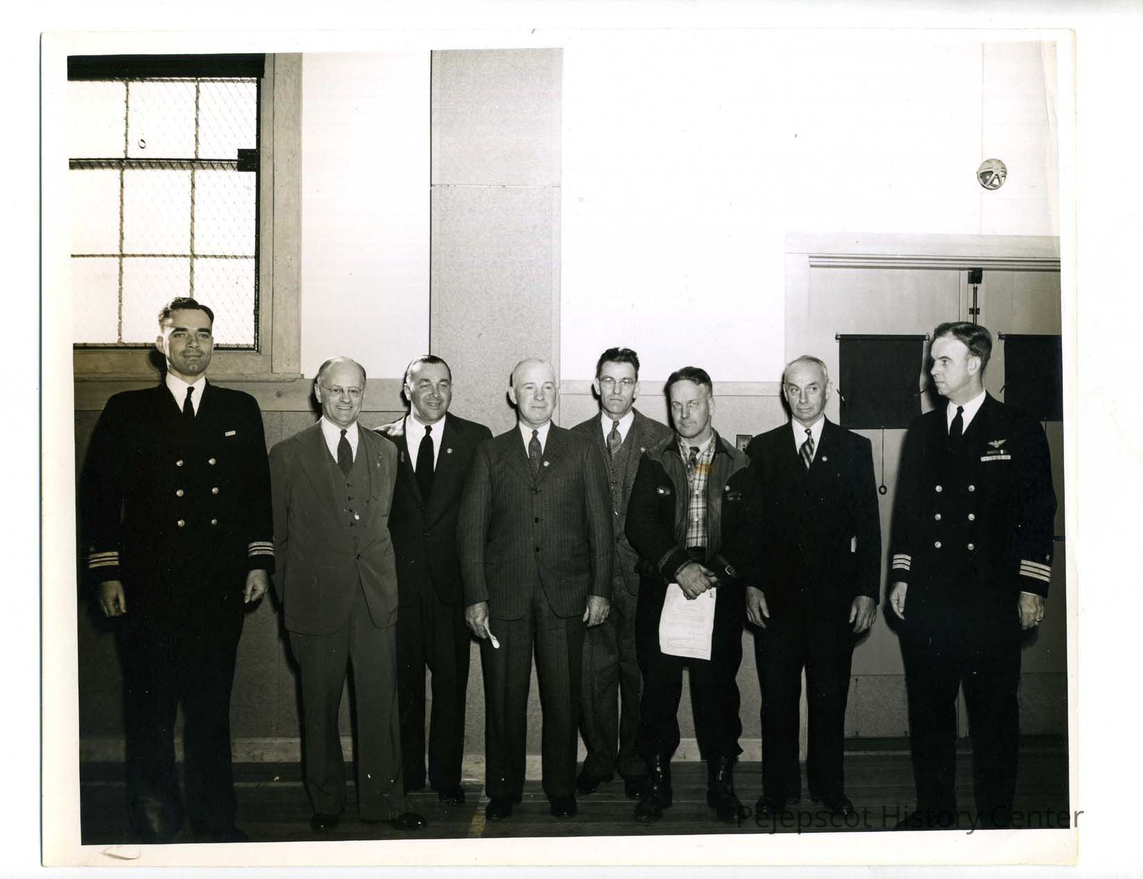Six civilians and two naval officers line up in a building facing the camera. Left to right they are: Lt. Cmdr. A.G. Husband, E.J. Calley, J.L. La Chance, Edwin Butter, C.B. Finley, L.E. Picket, W.S. Hall, Cmdr. J.C. Alderman. Stamped on the back is; "RELEASED OFFICIAL NAVAL PHOTOGRAPH IF PUBLISHED CREDIT MUST BE READ 'OFFICIAL U.S. NAVY PHOTOGRAPH' . A second stamp reads OFFICIAL U.S. NAVY PHOTOGRAPH PHOTO LAB -NAS-BRUNSWICK, ME. BRUN NO. 304-11-43 DATE 29 NOV 1943"Lexicon