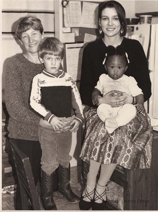 A B/W photographic view of 2 women with children. Published 10/1/1992