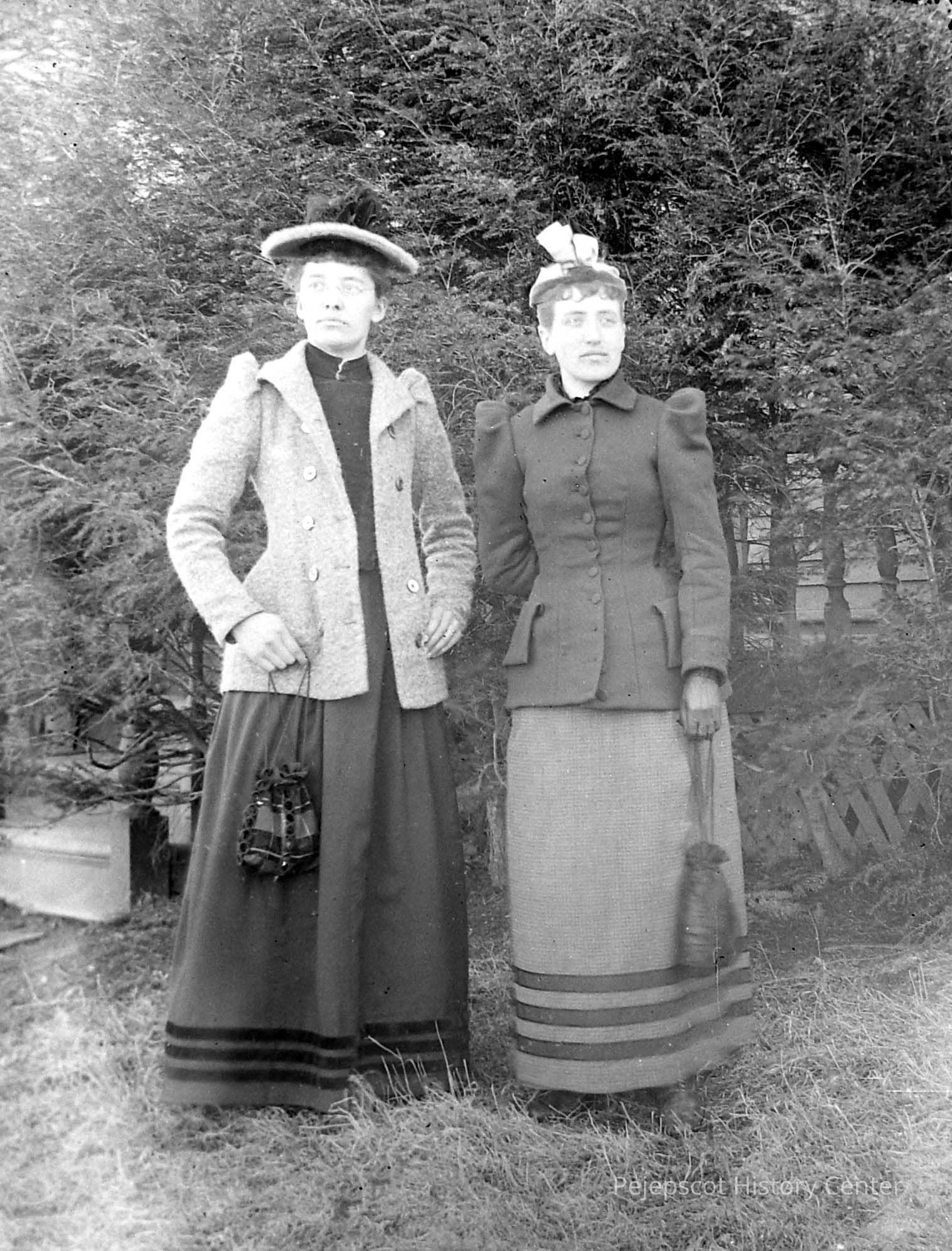 A glass plate negative with a photograph of two unknown women in front of brush. "CD-R "Glass Negs #2" #45 Undated.
