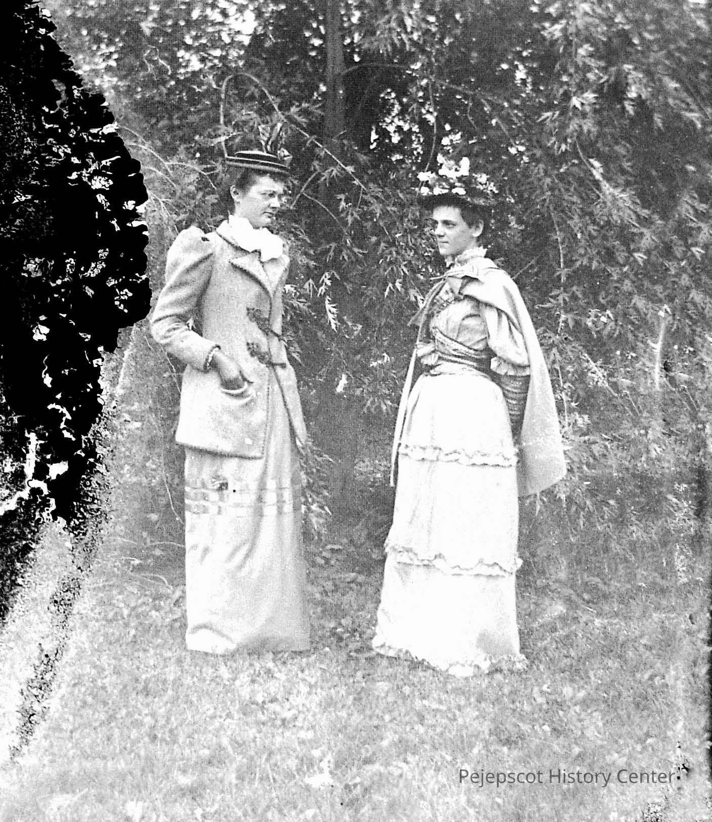 A glass plate negative with a photograph of two unknown women in front of brush. "CD-R "Glass Neg #4" # "form 024" Undated.